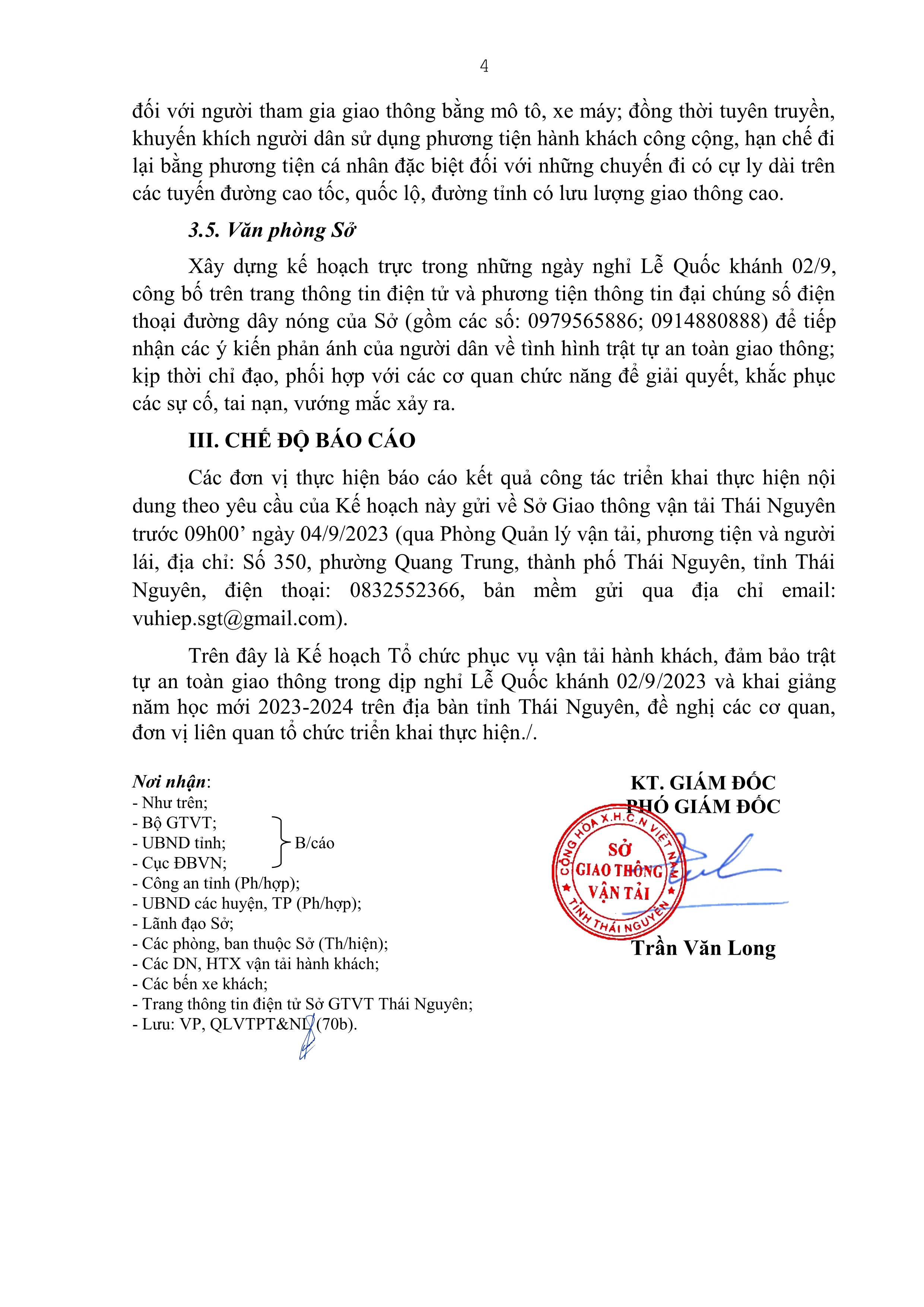 Sở GTVT Thái Nguyên: Kế Hoạch tổ chức phục vụ vận tải hành khách, đảm bảo trật tự an toàn giao thông trong dịp nghỉ Lễ Quốc khánh 02/9/2023 và dịp khai giảng năm học mới 2023-2024